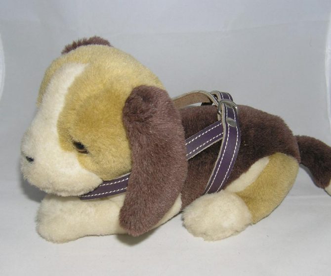 Oprsnica za male pse, podložena s flisom vijolične barve, črna, s svetlo vijola tačkami in pentljico. Možna tudi druga varianta – svetlo vijola osnova s črnimi tačkami.