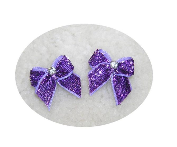 Par pentljic iz svetlečega traku, vijolični, s kristalom v centru, primerni za maltežane.
